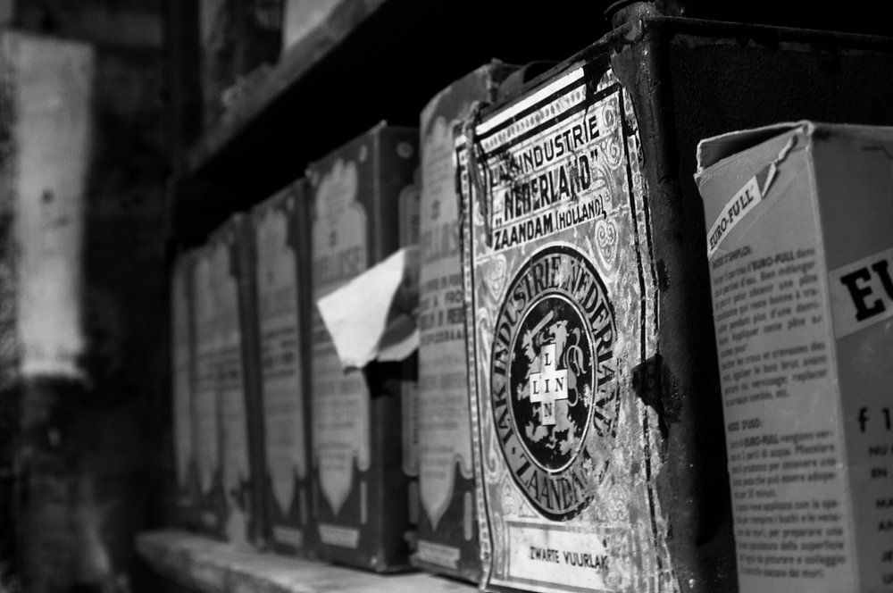 Verf in oude dozen op de plank in Zwart Wit