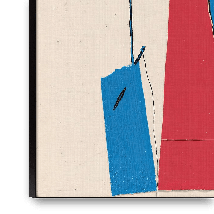 A minimalist composition of striking blue and red shapes against a cream-coloured background. A tall red triangle forms the central element, flanked by a long blue rectangle on the right-hand side. At the bottom left is a smaller blue area, connected vertically to the top edge of the image by a fine black line. The clean edges and the…