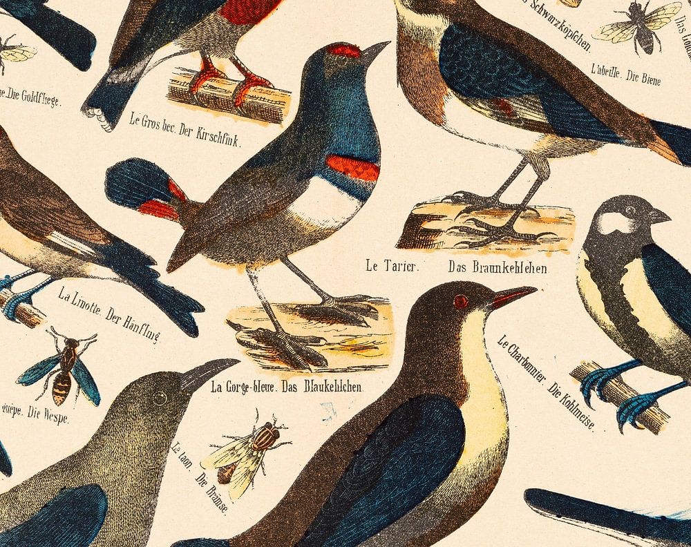 This is a reproduction of a very old school plate showing a wondrous collection of songbirds. This is a forerunner of the lithograph technique, the print is from c. 1875. the drawings are naively designed and coloured.