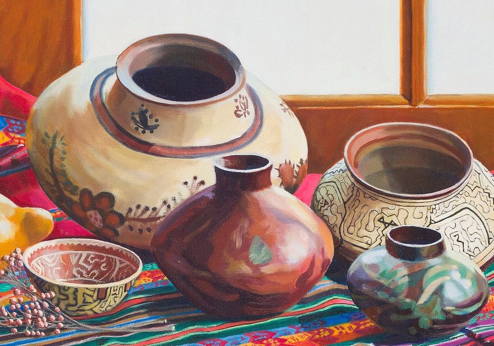 In this still life I am interested in highlighting the colourful patterns of the crimson cloth (used here as a tablecloth) and especially in harmony with the indigenous vessels, which are also painted with Indian designs. At the same time, it is a way for me to approach these objects and to feel contemplative and respectful towards the people who made these vessels and fabrics. They stand there gracefully and reveal themselves to my eye. In the background, a part of my everyday life remains in my studio, which was built from wood, and it is important to me to be able to describe the texture of the wood, the cloak and the vessels in their essence. Everything is at peace.
