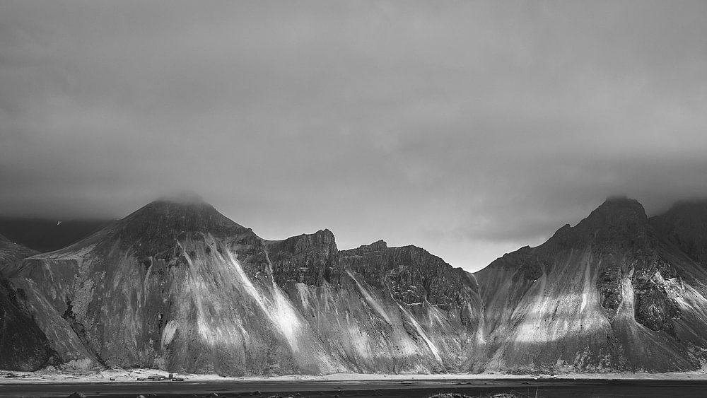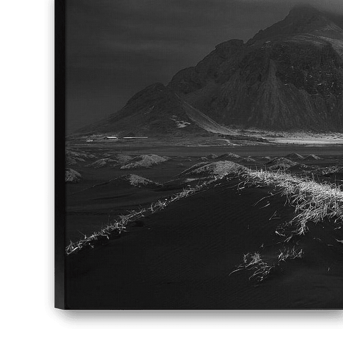Impressive Vestrahorn in Iceland shot from Stoksness Peninsula. Printed in black and white.