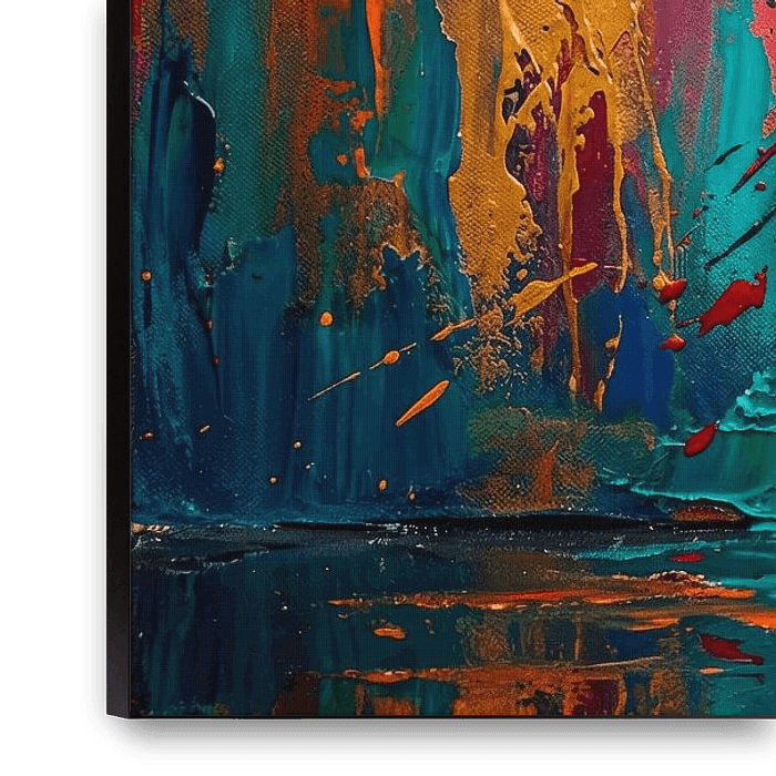 A powerful contemporary abstract painting featuring a luminous orange flower bursting against a dramatic vertical spectrum background of red, yellow, teal, and deep blue. Dynamic paint splashes and textured brush strokes create energy and motion, while the dark reflective base adds depth and contrast. This bold, modern floral artwork is…