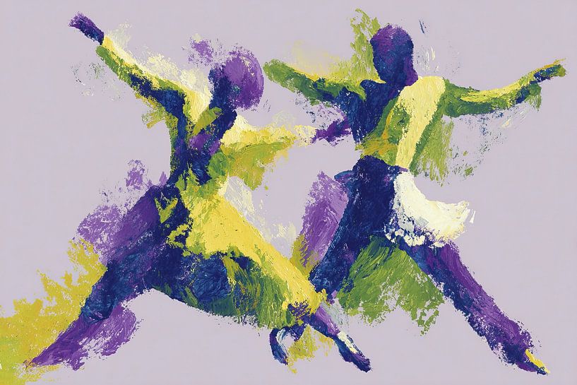 Vibrant Expressions in Motion - This is a dance painting featuring two energetic figures captured in lively movements, with a playful combination of purple and yellow that emphasises their dynamism.