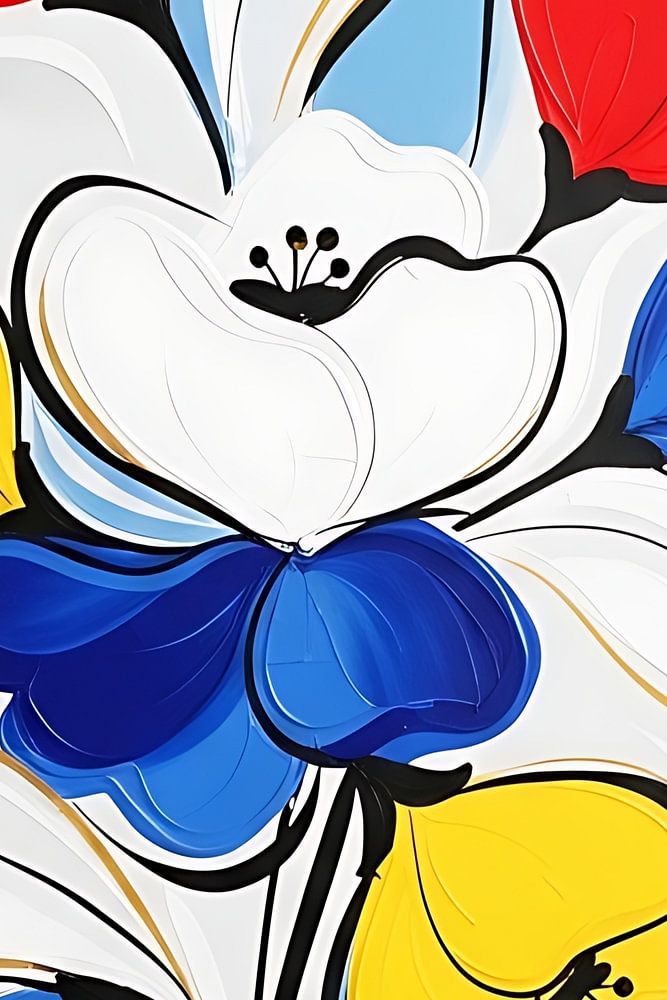 “Vibrant Harmony of Flowers” is a vivid and uplifting artwork that celebrates the timeless beauty of nature in a bold, modern form. The composition presents a bouquet of blossoms in red, blue, yellow, and white, each petal outlined with strong, fluid lines that emphasize movement and vitality. The arrangement of colors creates a joyful rhythm, where every flower seems to dance freely, radiating positive energy and charm.