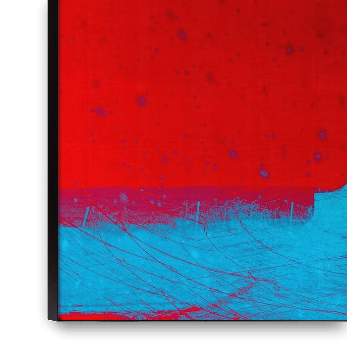 Get carried away by the hypnotic colours of "Vibrant Horizon," an artful photograph that invites the viewer into a world of abstraction and emotion. This masterpiece is a powerful composition dominated by a deep red and purple top, transitioning into a striking aquamarine blue shape reminiscent of a mountain or a stylised landscape. The…