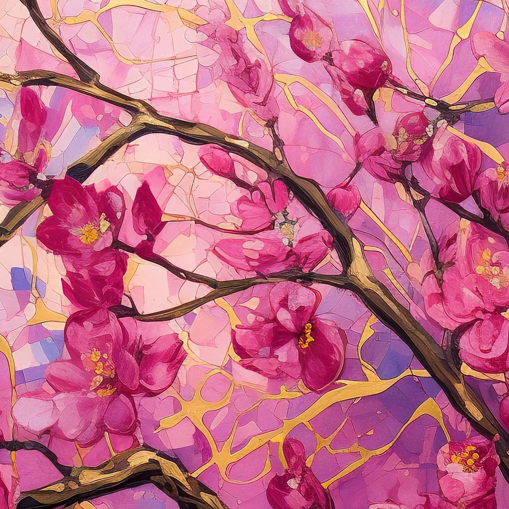 Vivid Pink Blossoms | Floral Mosaic Art - This lush painting captures the delicate beauty of pink blossoms, presumably cherry blossoms, against a vividly textured background. The variety of pink nuances is dynamically and stylishly applied in an almost mosaic-like composition, giving a fresh and modern take on a classic floral theme.