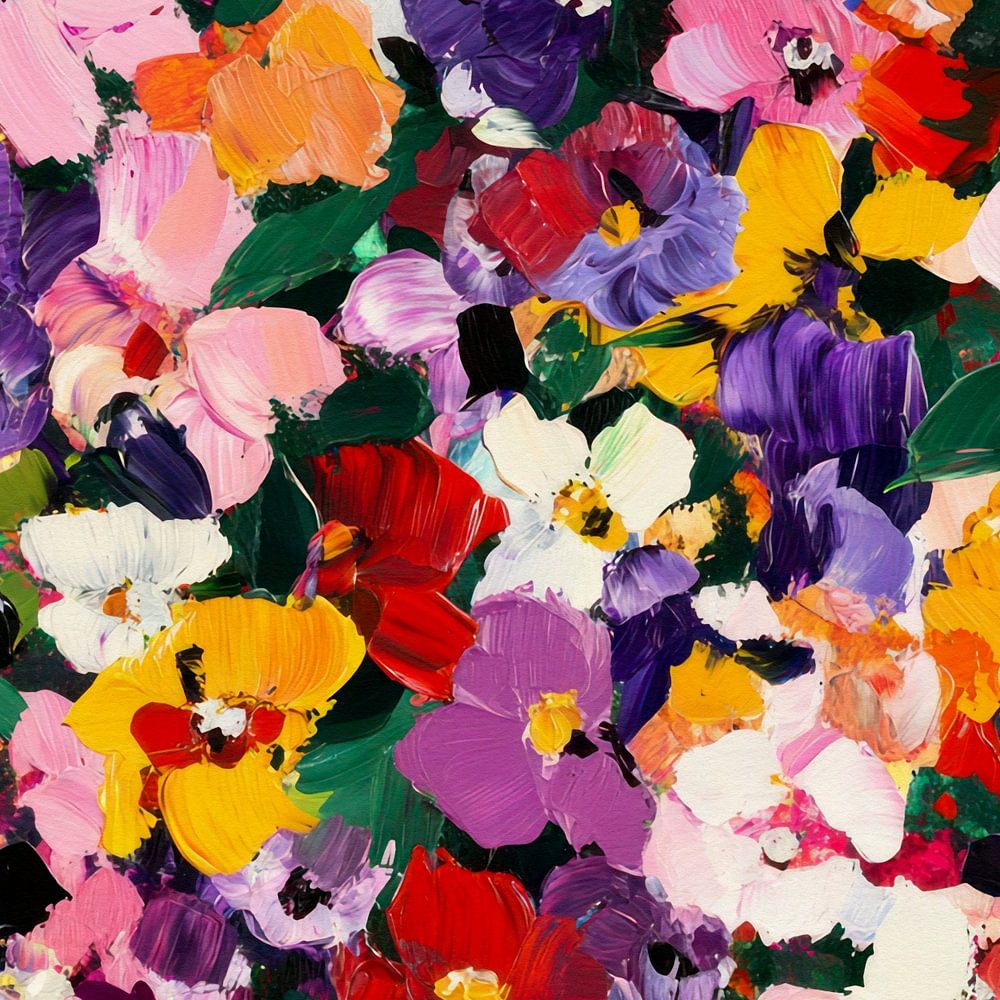 This abstract flower painting in acrylic shows a dynamic explosion of colour. Bold brushstrokes in vibrant shades of red, blue, yellow, purple and green intertwine to create expressive, abstract blooms. The lack of defined shapes gives the work an energised, free-flowing feel, with each stroke reinforcing the sense of movement and life. The variety of colours blend harmoniously, creating a visual celebration of the beauty of nature in a modern, energetic style. The composition is full of colour and emotion, capturing the essence of joyful abstraction.