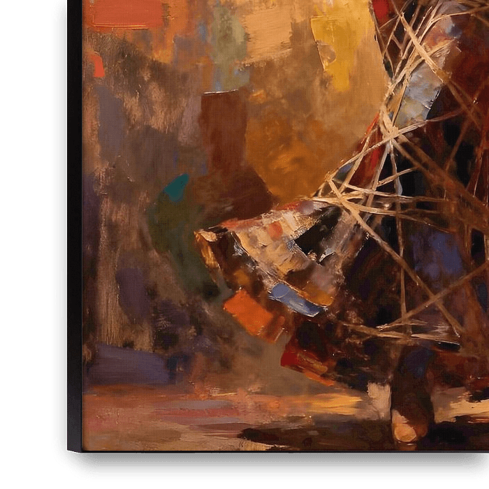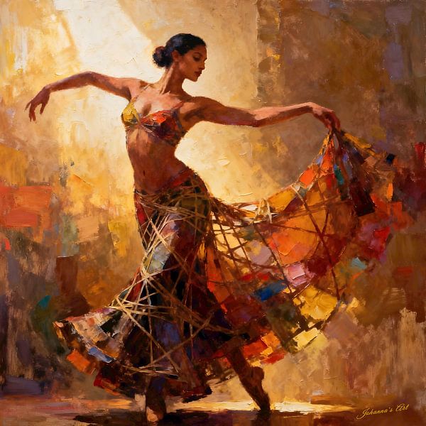 This artwork presents a captivating vision of a flamenco dancer caught in the height of motion, embodying passion, rhythm, and refined elegance. Her body is poised with arms gracefully outstretched, conveying both strength and fluidity, while her vibrant, multi-colored skirt erupts into a swirling dance of reds, oranges, yellows, and…