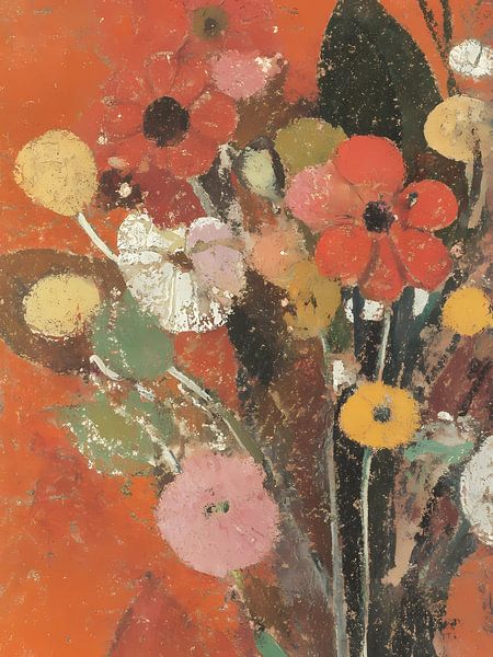 A bold, textured bouquet bursts with earthy tones and expressive brushstrokes.