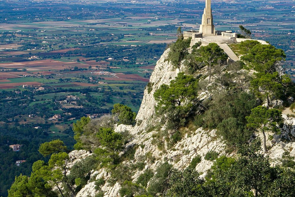 View from Sant Salvador (Mallorca) to a cross statue in front of landscape with mountains in the background