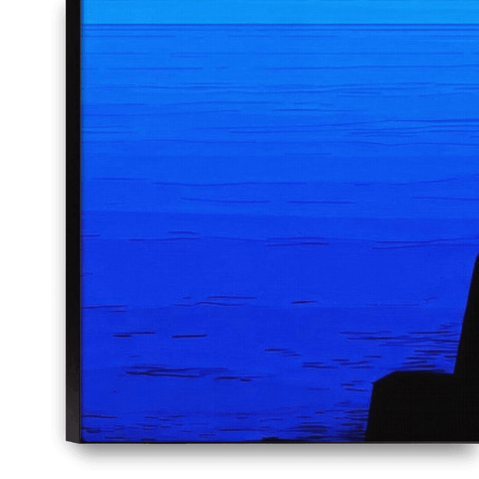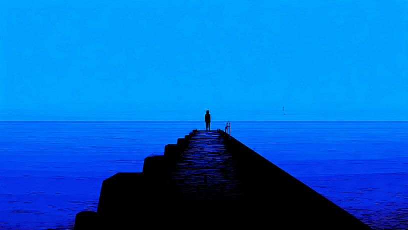 This artwork depicts the silhouette of a person standing at the end of a wooden jetty, gazing out over a calm, vast expanse of water. The figure is rendered entirely in black, creating a striking contrast with the deep shades of blue that dominate the sky, the water and the surroundings. The scene exudes tranquillity, reflection and a…