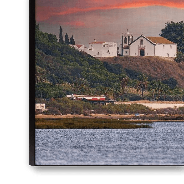 Digital panoramic photo showing a view of Cacela Velha, a beautiful small typical Portuguese village, seen from Ria Formosa nature reserve off Cabanas de Tavira in the Algarve (Portugal).