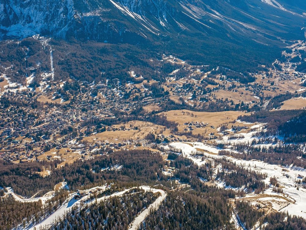 This photo shows the view from the Tofana ski area down to Cortina d'Ampezzo.