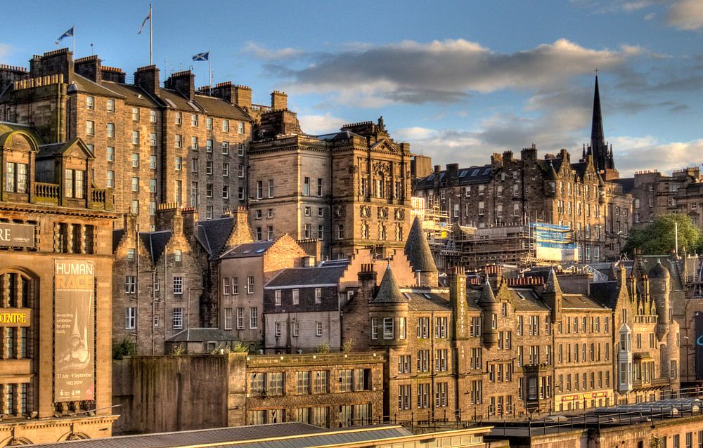 View of historical buildings in Edinburgh, Scotland in the light of the setting sun