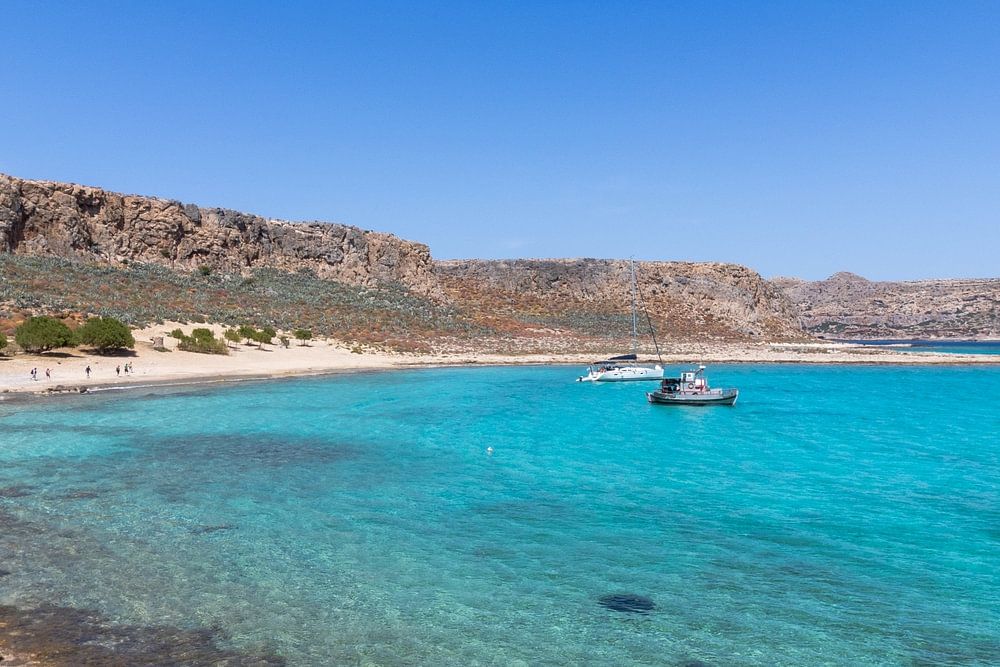 Beautiful blue water at the beach on Gramvoussa island in Crete. On the right of the picture, you can see a shipwreck close to the beach.