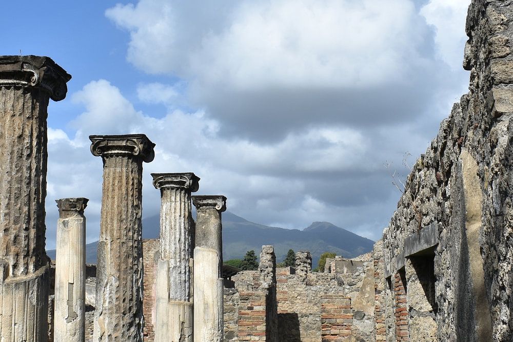 The photo shows a well-preserved section of buildings in Pompeii, with ancient, weathered stone walls and a cobbled street stretching under a bright blue sky. The buildings along the road have partly collapsed, but it is clear to see how ancient Roman city life once took place here. In the background, Vesuvius towers majestically above the city. The volcano, which devastated the city in AD 79, is a symbolic element in the picture, highlighting both the city's transience and the power of nature. The contrast between the ancient ruins of Pompeii and the volcano in the background gives a sense of time and history captured in the moment.
