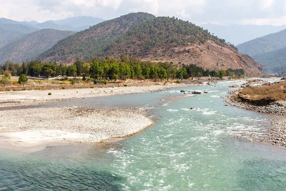 View of Punakha Dzong Monastery with the Mo Chhu River and mountain scenery, Bhutan, Asia