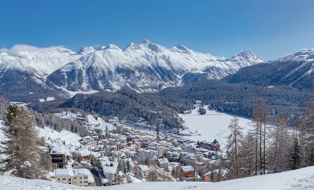 View of St Moritz, Muattas Muragl, Piz Vadret, Sankt Moritz, Oberengadin, Switzerland