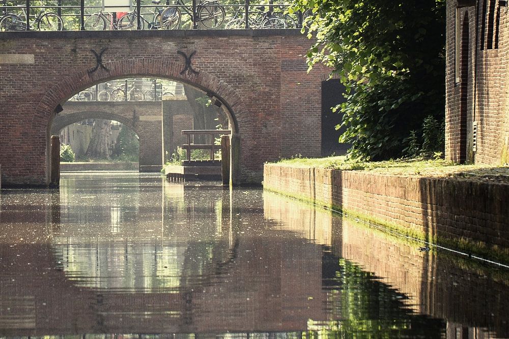 View of the Brigittenbrug from the Nieuwegracht canal in Utrecht. Photo from June 2016, taken from a boat by Utrecht photographer André Blom. Left and right the wharves and wharf cellars that are unique in the world.