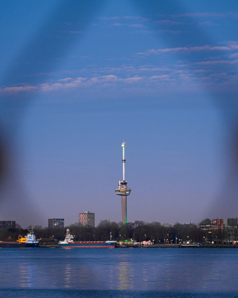 This image captures the essence of Rotterdam: a city full of dynamism, seen through a surprising and artistic frame. The Euromast, symbol of progress and city views, proudly rises above the skyline, a beacon of recognition for Rotterdammers and visitors alike.