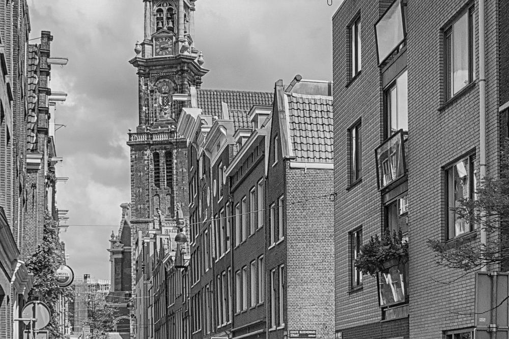 The most famous tower of Amsterdam is that of the Westerkerk. The characteristic crown is seen from almost all of Amsterdam. The picture is made from Bloemstraat in the heart of the Jordaan. The tower itself is on the Prinsengracht, next to the Anne Frank House. The picture is available in color as well as black and white. There is also a standing for sale next to this lying version.