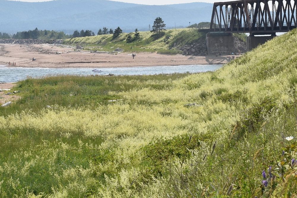 View of the beach and bridge in summer, Barachois, Percé, Quebec, Canada