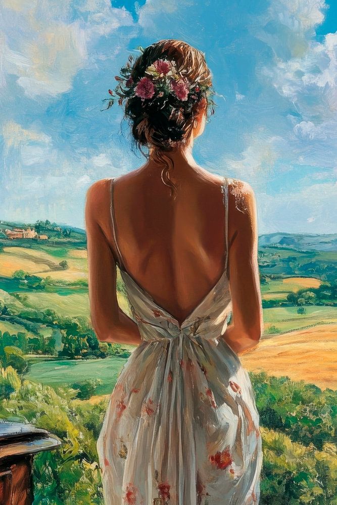There is a delicate hint of freedom in the air as the woman gazes gracefully into the distance. Her floral dress shimmers in the light of the gentle sun, and the view over rolling hills and fluffy clouds promises undiscovered adventures. A melancholy moment of stillness, captured between dream and reality.