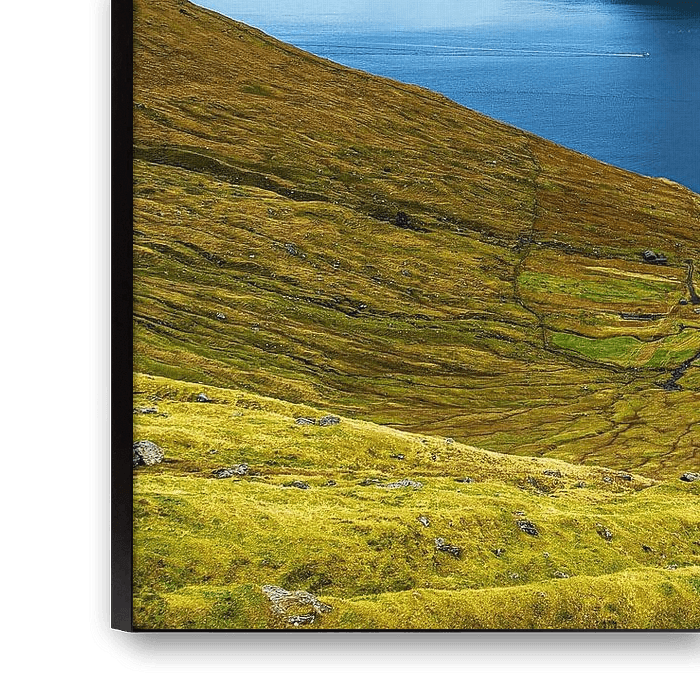 Buy the photo View of the village of Funningur by the fjord Funningsfjørður on the by Rico Ködder on canvas, ArtFrame, poster and wallpaper, printed on demand in high quality.