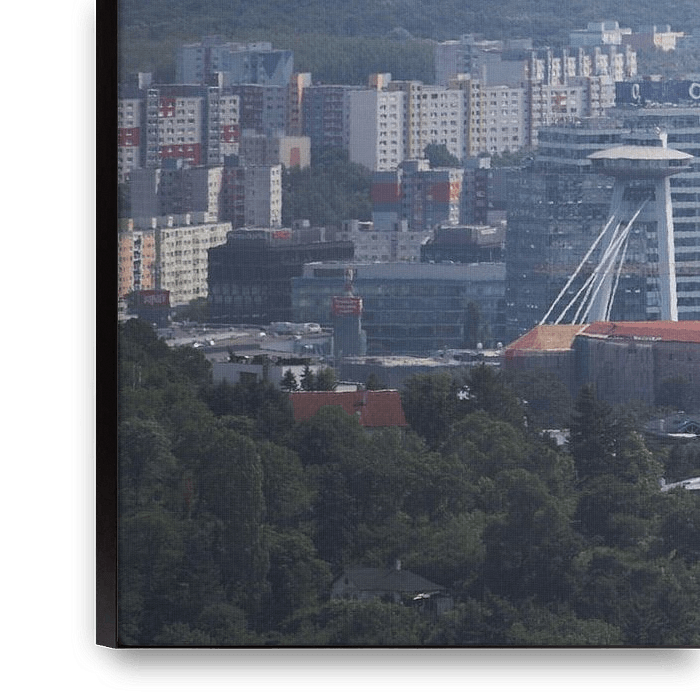 View of two of Bratislava's iconic sights: the Most SNP (also known as the UFO Bridge) and Bratislava Castle.