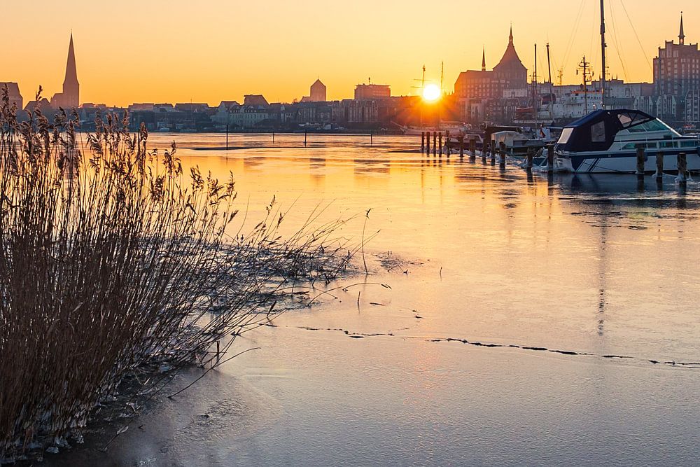Buy the photo View over the Warnow to Rostock in winter by Rico Ködder on canvas, ArtFrame, poster and wallpaper, printed on demand in high quality.