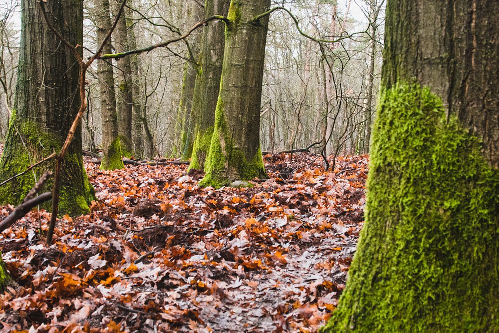 Fallen leaves between the moss-covered trunks of a row of oaks in Hoge Veluwe National Park.