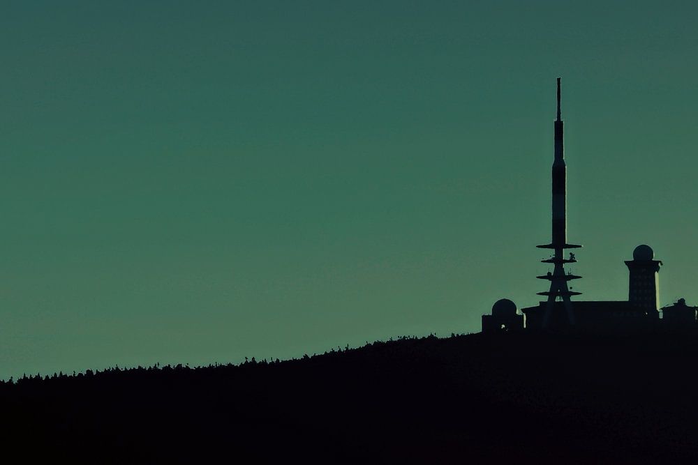 View to the summit of the Brocken in the Harz National Park from a hiking trail in the Torfhausmoor in the early morning before sunrise.