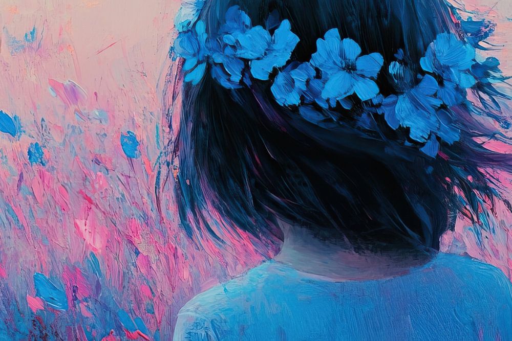 View - Panorama with flowers. Panoramic view girl with flowers. Impressionism portrait painting of woman at a view of a landscape.