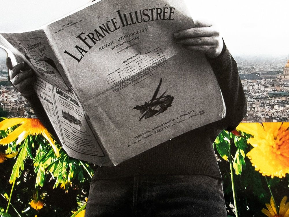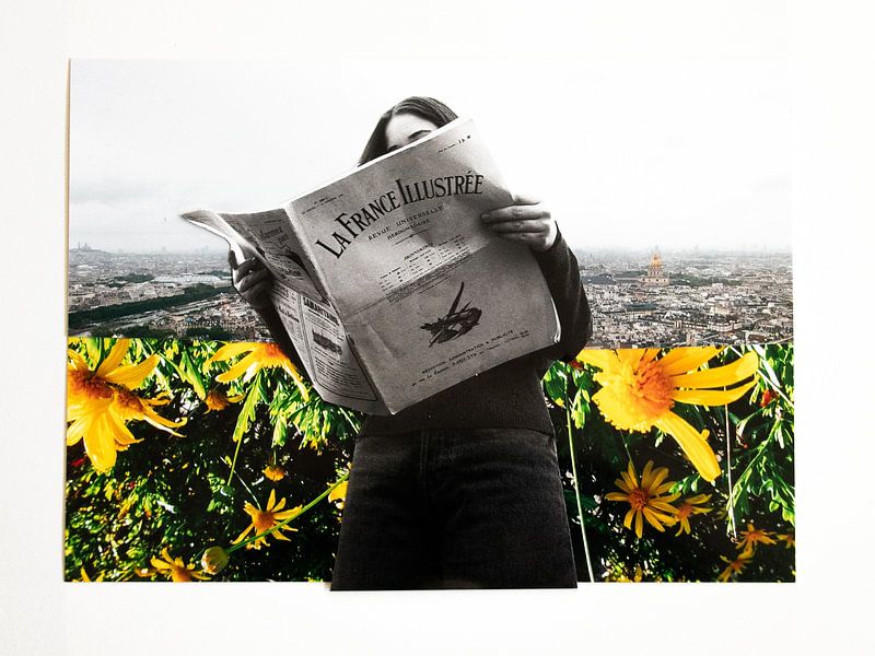 This work centres on a woman, absorbed in reading a French newspaper. She has been cut out and placed within a collage of three images: above her, Paris stretches out, viewed from above, whilst below her a field of yellow flowers completes the scene. By combining these layers, a surreal and playful whole is created, in which everyday…