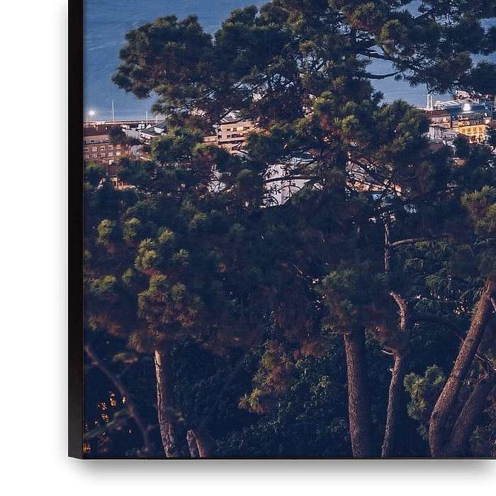 The photo was taken at blue hour and shows a view from the Castelo do Castro over the harbour and the fjord-like bay Ría de Vigo.