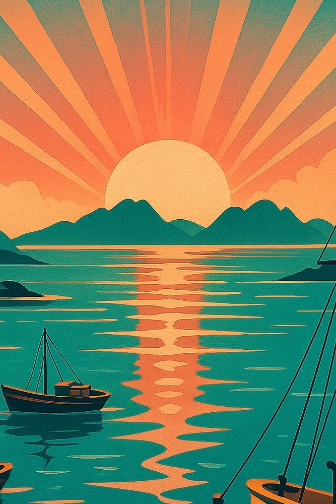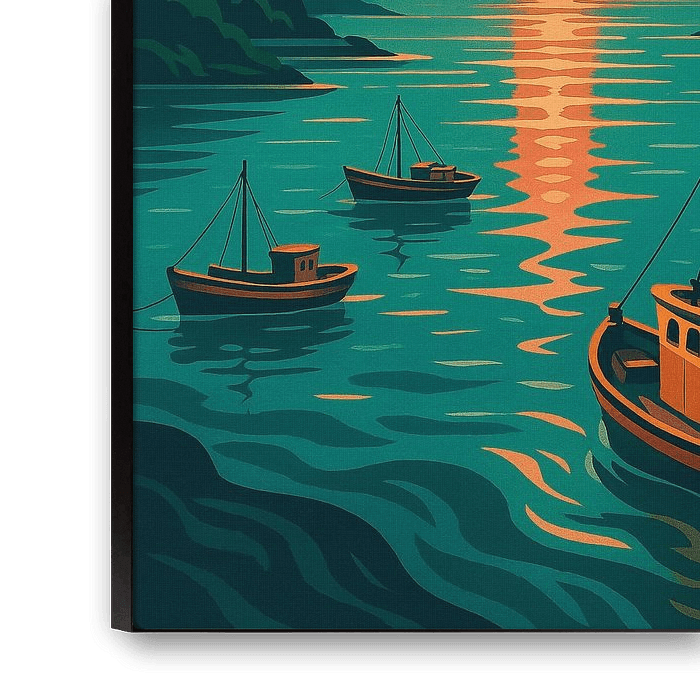 This Vigo Art Deco poster captures the beauty of Galicia’s largest city at sunset, with fishing boats gently floating on shimmering waters under radiant beams of golden light. Designed in the style of a vintage travel poster, it combines vibrant Art Deco colors—emerald greens, sunset oranges, and deep blues—with a sense of calm maritime elegance. Vigo is known for its bustling harbor, stunning coastline, and its gateway to the Cíes Islands, part of the Atlantic Islands National Park. This artwork reflects both the working spirit of its seafaring traditions and the natural beauty of its coastal landscapes. Perfect for anyone who appreciates Spanish coastal cities, nautical themes, or vintage travel aesthetics, this Vigo poster adds warmth and style to any room. Whether hung in a living space, office, or holiday home, it brings the atmosphere of Galicia’s sunsets and seascapes into your décor.