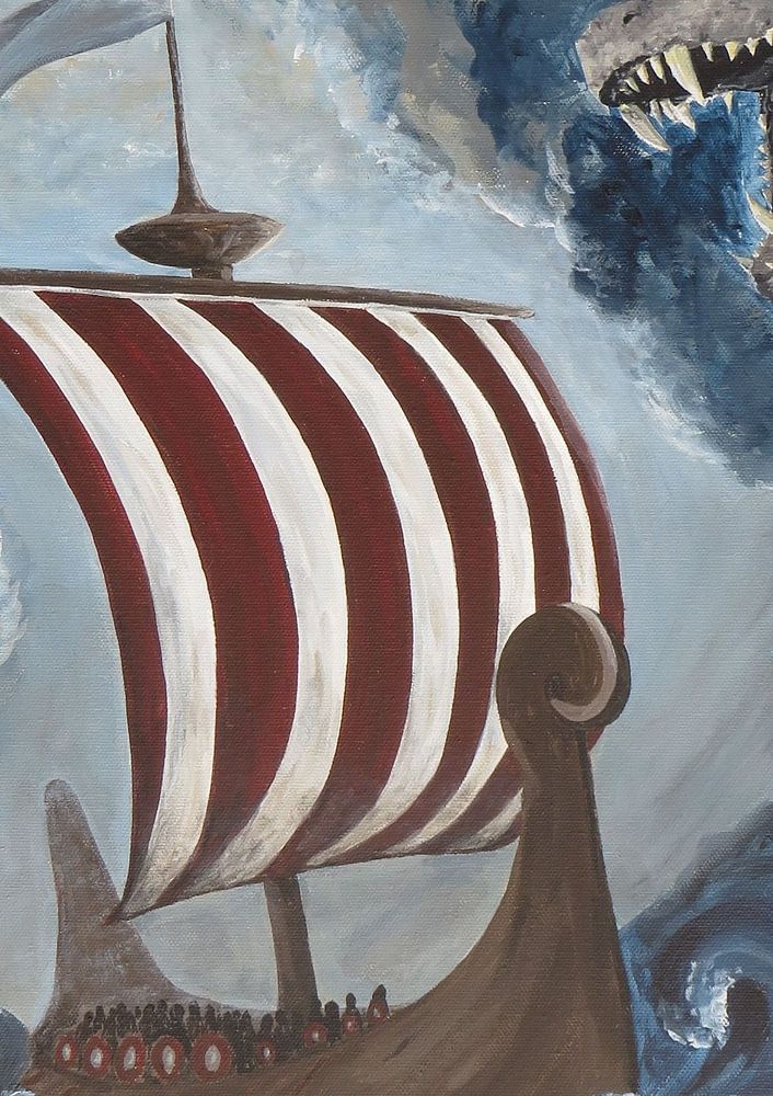 This painting shows a Viking boat in the raging sea, a dragon roars towards the Vikings in a storm. The journey bravely continues.