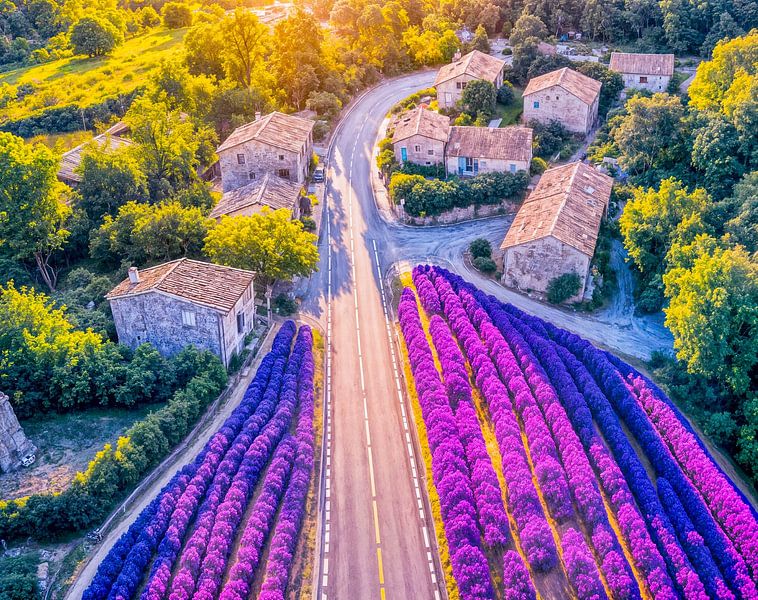 Winding roads meander through a village surrounded by blooming lavender fields. Warm sunlight enhances the tranquil and aromatic scenery.