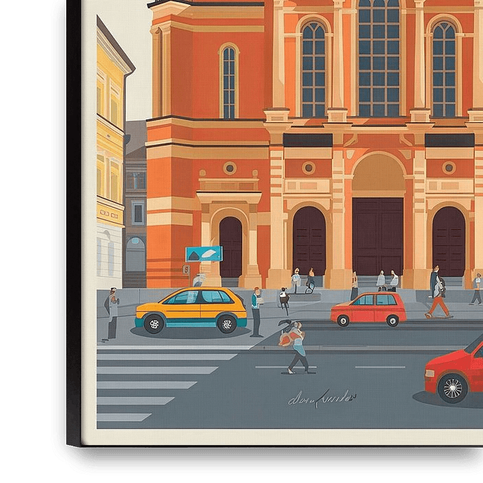 In the heart of Vilnius rises an impressive building with striking towers and a bright red brick design. The dynamic street view pulsates with life as colourful cars pass by. A bright blue sky provides the perfect backdrop for this architectural masterpiece that epitomises the history and culture of Lithuania.