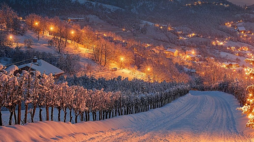 Vineyard in Christmas atmosphere, complete with a Christmas tree and snow. Cosy village in the hills with lights shining through cottage windows. Christmas tree with lights and a beautiful star. Snowy landscape, Christmas.