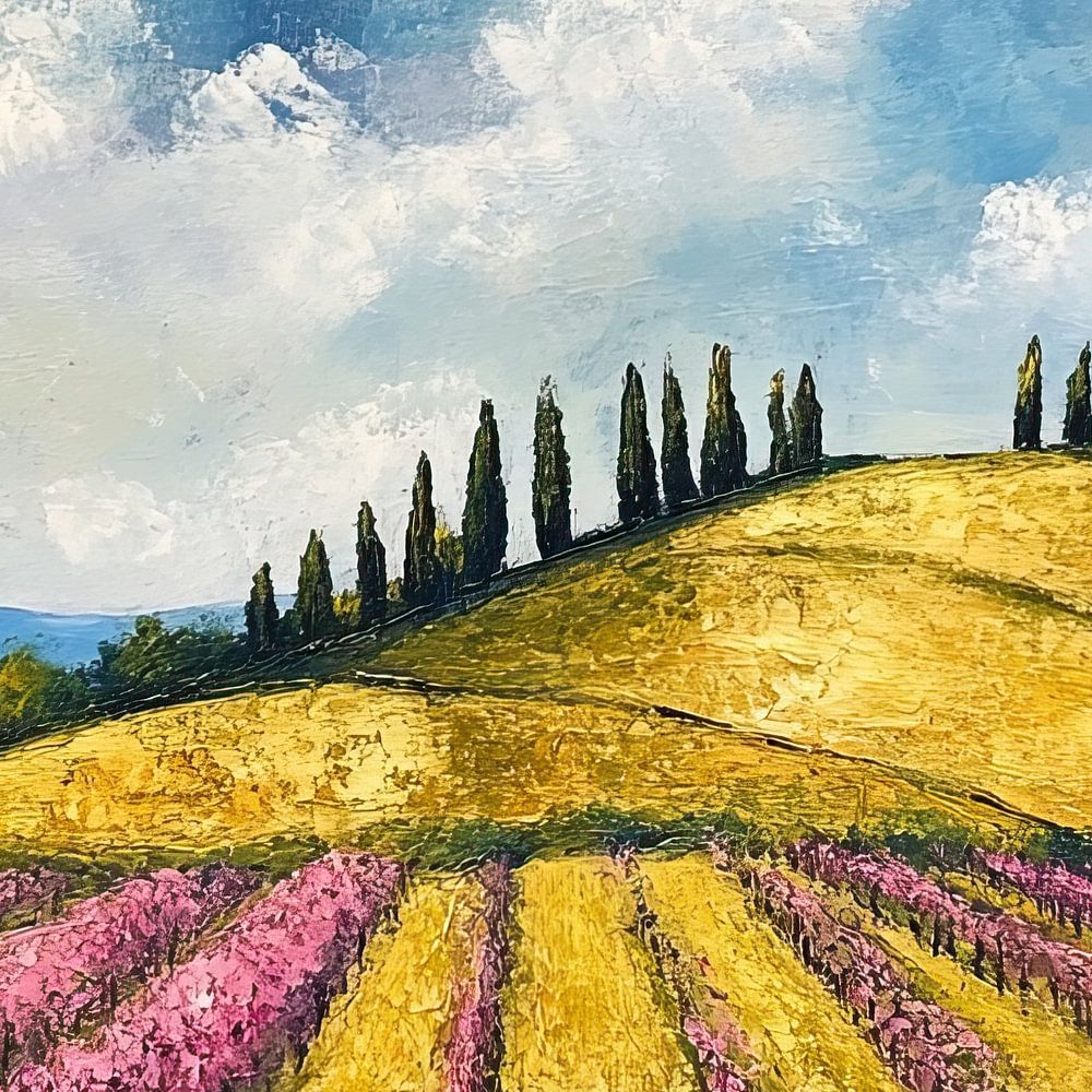 Vineyard Landscape | Sunset Lavender Fields - This landscape painting shows a rolling hill with geometric patterns of flowering vines under an impressive cloudy sky.
