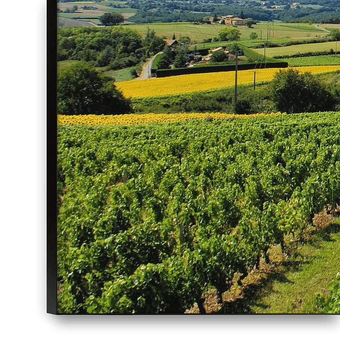 Undulating vineyards on the hills of France. Interspersed with sunflower fields. The image that everyone has of France.