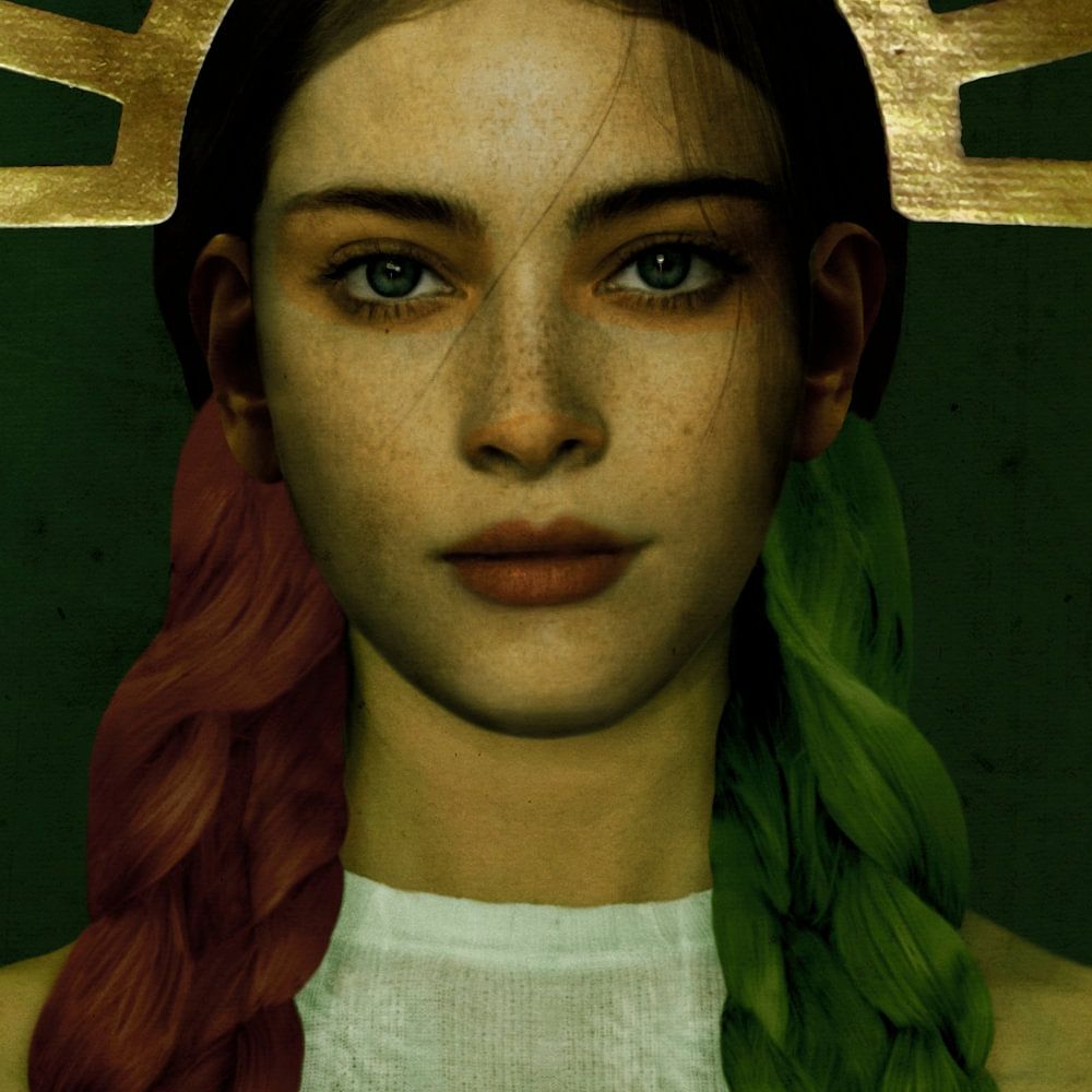 Above her forehead floats a simple, spiky crown of dull gold - a statement of whimsy rather than royal splendour. She wears a white lace top, minimalist but elegant, a subtle contrast against the colourfulness of her hair.