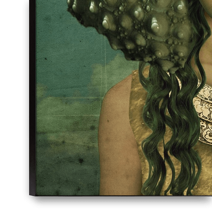 Vintage Beauty, clad in gold clothing, wears a large sea urchin shell on her head like a Golden Crown, it was a symbol of protection of the underwater world. Her neck wore an antique gold chain, an heirloom from generations. The necklace glistened in the sunlight, a reminder of days gone by. In the background, a blue sky stretched with…
