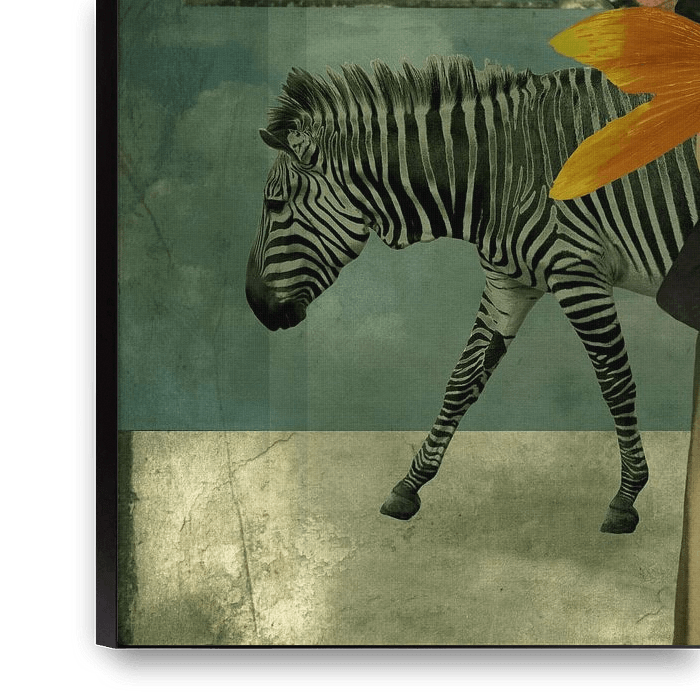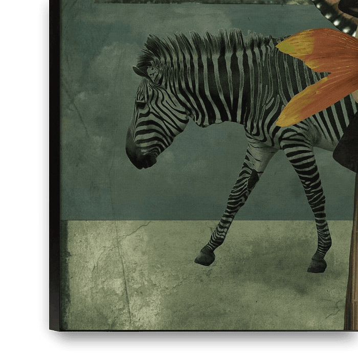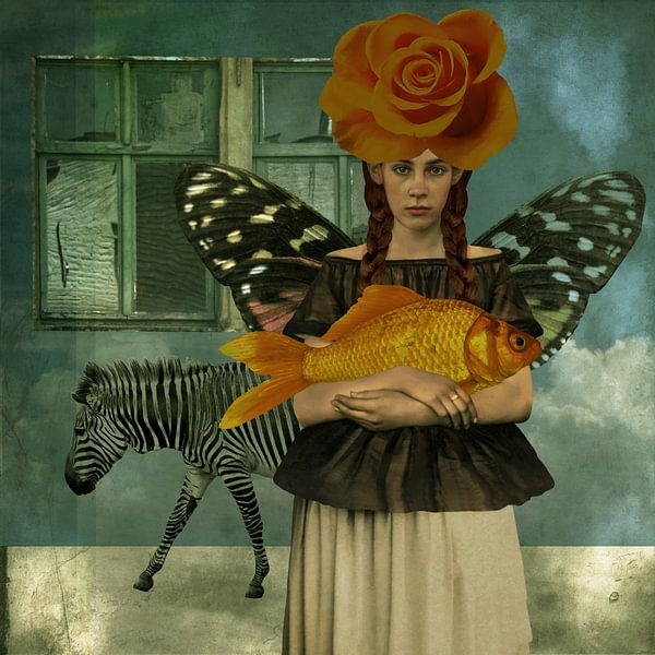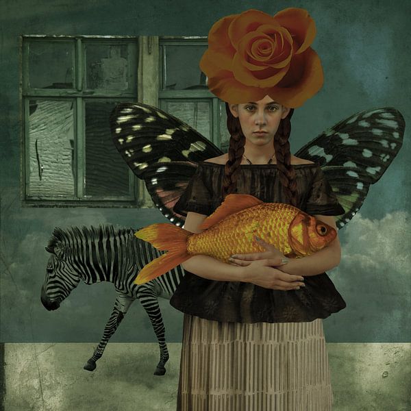 Vintage Beauty in white dress with butterfly wings & a silver vintage purse. On her head, she wears an orange rose. The window against the blue sky symbolises memories. The zebra contrasts symbolically with the butterfly.