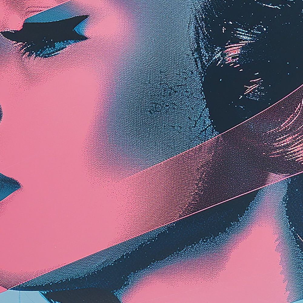 Monochrome retro riso print of a beautiful woman with a blue and pink background in a swirling vintage style. This poster combines timeless charm with vibrant colours and a striking design, making it a perfect choice for a unique and playful wall decoration. The woman's elegant shape and dynamic colours combine to create a captivating piece of art that is both stylish and eye-catching.