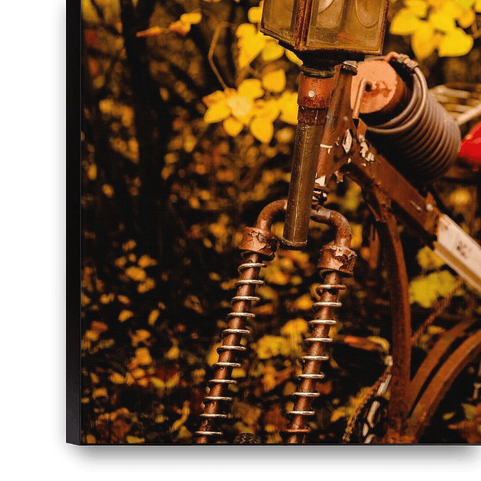 Rusted vintage bike with lantern‑style headlight and coil springs set against golden fall leaves. Bold photographic wall art for lofts, cafés, halls and offices.