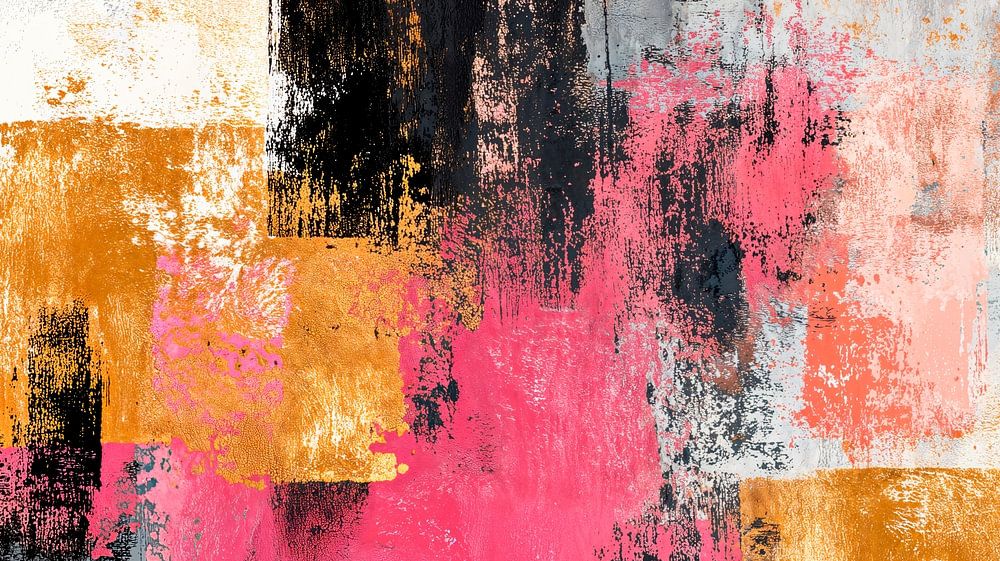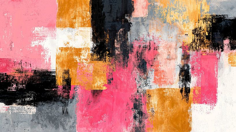 An abstract painting with a dynamic composition of powerful colours and textures. The canvas is filled with large, overlapping geometric shapes in vibrant hues in a mix of rough brushstrokes and smooth surfaces that create a sense of movement and depth. Balancing chaos and harmony, the overall style has a contemporary, energetic feel.