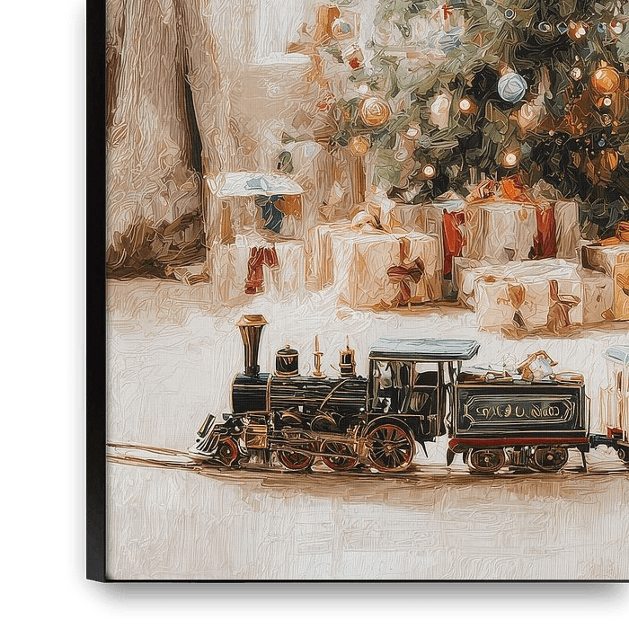 This artwork exudes pure Christmas spirit and nostalgia. In an atmospheric room is a beautifully decorated Christmas tree, full of twinkling lights and colourful baubles. Around the tree are carefully wrapped presents with bows, evoking the excitement and anticipation of Christmas Eve. At the base of the tree, a classic toy train runs…