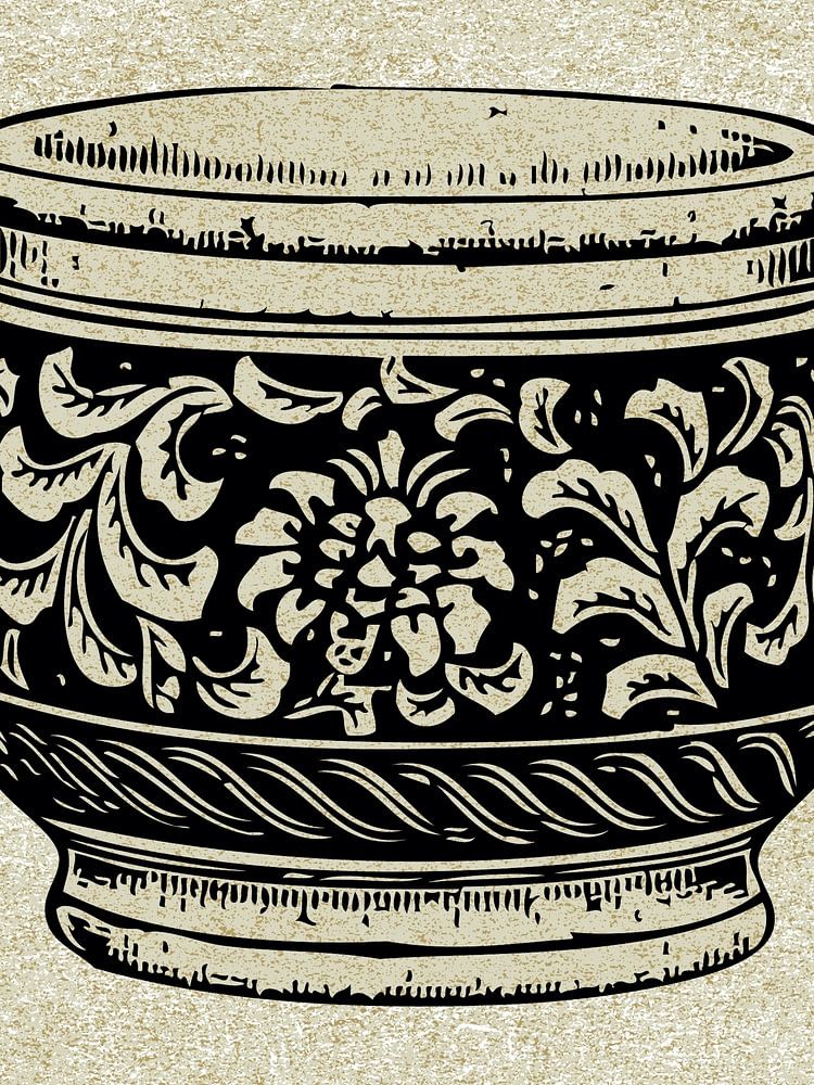 A retro drawing of a flower pot with floral patterns in the beige and black on golden texture. Modern art in the trend of the time.